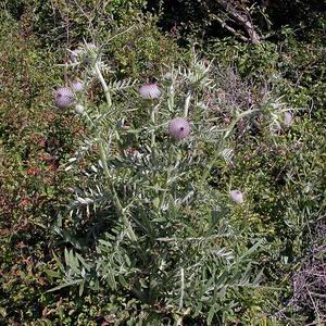 Описание. Растение колючее из семейства сложноцветных (Compositae Adans.), распространенное в Южной и Средней России. Стебель высокий, ветвистый, паутинисто-пушистый; листья снизу беловойлочные, глубоко-перисто-раздельные, с линейно-ланцетными, обыкновенно раздвоенными долями, кончающимися крепкой колючкой; Цветы собраны в одиночные крупные головки, шаровидной формы, паутинистые, на о лиственных ножках и окруженные при основании несколькими листьями, с обверткой или покрывалом из отогнутых, шиповато-реснитчатых на верхушке наружных листочков, лопатчато-расширенных, и колюче-остроконечных средних и тонко-шиловидных, с мягким окончанием внутренних. Головки двудомные с запахом ванили; цветы однополые. Пончик трубчатый с 5-раздельным отгибом, который короче его трубочки. Тычинок 5, с волосистыми нитями; столбик нитевидный, на верхушке неглубоко-двулопастный; завязь нижняя одногнездная; плод – семянка, сжатая с боков, без ребер, снабженная летучкой из многорядных волосков. Волоски короче венчика. Цветет с конца июня до сентября. Растет на холмах, каменистых местах, при дорогах. Молодые побеги и неразвившееся еще цветоложе употребляются в пищу.