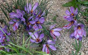 Описание. Многолетнее травянистое растение из семейства касатиковых (Iridaceae Juss.), родом с Востока, снабженное клубнем величиной с грецкий орех. Зеленые узкие острые листья, окруженные при основании несколькими перепончатыми чешуйчатыми листьями, во время цветения одинаковой длины с фиолетовым цветком или длиннее его. Околоцветник воронковидный, лепестковидный, о 6 равных долях. Тычинок 3; завязь нижняя 3-гнездная, с нитевидным столбиком и 3 лепестковидными ярко-оранжевыми, на верхушке слегка реснитчатыми рыльцами, равными отгибу околоцветника. Плод – коробочка. Цветет осенью. Возделывается в большом количестве в Западной Европе, на Востоке и у нас в Закавказье ради цветов, высушенные рыльца которых дают шафран, употребляемый в медицине и, как безвредное красящее вещество, в ликерном производстве и в кондитерском деле.