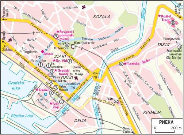 Вид крупного промышленного города Риеки едва ли восхитит посетителя с первого раза. Фасады монументальных зданий и дворцов XIX-XX вв. загрязнены выхлопными газами, местами с фасадов облупилась штукатурка. Риека – самая северная гавань далматинского побережья Адриатики, и для многих туристов представляется не более чем транспортным узлом. Но при более близком знакомстве с Риекой и ее окрестностями можно оценить всю красоту этой местности, богатой древними историческими памятниками. Если идти с запада от Опатии к указателю Centar (центр), мимо вокзала, дорога приведет к площади Жабица (Trg Zabica) с оригинальной по архитектуре церковью Капуцинов, от которой далее на юго-восток тянется портовая улица Рива (Riva). Здесь -центр, и водителям автомобилей надо подыскать подходящую парковку (лучше всего – около рынка, справа от Ривы, у Ривы Бодули (Riva Boduli). Рынок Тржница (1) (Trznica), крытое сооружение из двух павильонов, был построен в 1881 г. Тогда эта конструкция из стекла и металла считалась суперсовременной. Вокруг рынка расположилось множество недорогих кафе и ресторанов. На Мертвом канале (Mrtvi kanal), бывшем устье Рьечины, где сегодня стоят пришвартованные лодки, расположен государственный *Национальный театр Ивана Зайца (2) (Ivan Zajc). Проект разработали венские архитекторы Феллнер и Гельмер. Электрический свет в городе впервые загорелся здесь, в театре, в 1885 г. В 1981 г. здание обновили, чтобы оно соответствовало всем условиям проведения драматических, оперных и балетных спектаклей. На фронтоне неоренессансного фасада представлена композиция от Августа Бенвенути, символизирующая драму и музыку. Помещение театра с его тремя рядами лоджий и балконом напоминает архитектуру барокко. Потолок украшен аллегорической живописью, созданной Францем Матчем и братьями Густавом и Эрнстом Климентами. В 1945 г. на сцене впервые прозвучал хорватский язык, и вскоре после этого город Фиуме был переименован в Риеку. В 1953 г. театру было присвоено имя «хорватского Верди» Ивана Зайца.