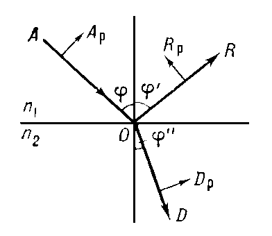 Расщепление падающего на границу двух диэлектрических сред луча света А на преломленный луч D и отраженный R. Для простоты показана ориентация только p-составляющих этих лучей, поляризованных параллельно плоскости падения.
