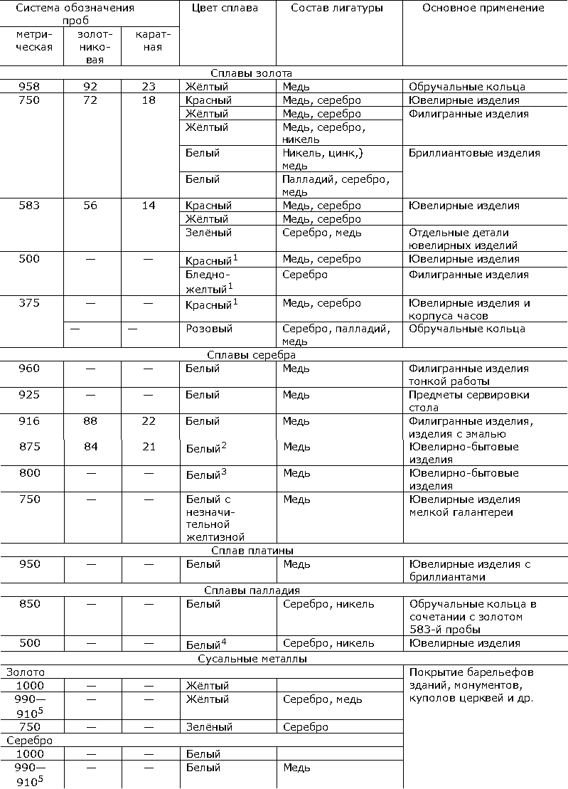 1 Сплавы в больших количествах применялись в период Великой Отечественной войны 1941—45. 2 Сплав наиболее распространён в СССР. 3 Сплав наиболее распространён в странах Западной Европы. 4 В СССР практического значения не имеет. 5 С интервалом 10 проб.