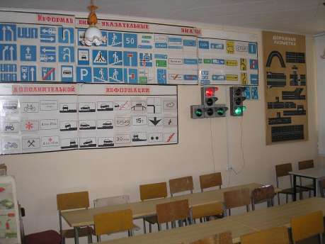 Если же говорить о занятиях в классе, то одно дело – когда преподаватель что-то чертит на доске, и совсем другое – когда он пользуется современной телевизионной и компьютерной техникой. То же самое касается учебно-методических материалов: в одной автошколе знаки дорожного движения, сигналы светофора и регулировщика, а также линии дорожной разметки изображены на древних картонных плакатах, а в другой – оформлены в виде современного красочного табло.