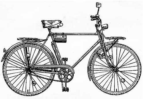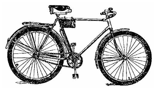 1 — втулка переднего колеса; 2 — руль; 3 — передняя вилка; 4 — рама; 5 — седло; 6 — насос; 7 — сумка; 8 — задний багажник; 9 — втулка заднего колеса; 10 — задний щиток; 11 — цепь; 12 — заднее колесо; 13 — педали; 14 — кареточный механизм; 15 — передний щиток; 16 — переднее колесо.