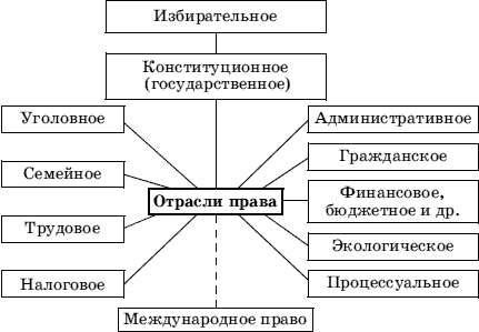 Право (а точнее, входящие в него нормативно-правовые акты) образует целостную систему, которая состоит из отраслей права (рис. 2) и институтов права. Отрасль права – это обособленная группа правовых норм и институтов, объединенных общностью социальных отношений, которые они регулируют. У каждой отрасли права есть свой предмет регулирования, свой вид общественных отношений, имеющих очевидную специфику. Основными отраслями права являются конституционное (государственное), гражданское, трудовое, семейное, административное, финансовое, бюджетное, уголовное, международное, процессуальное (гражданское), уголовное (арбитражное) и др. Институты права – это обособленные группы правовых норм, регулирующих однородные общественные отношения, но более мелкие, чем отрасли. Они входят в соответствующие отрасли права. Таковы, например, институт гражданства или институт прав человека, входящие в отрасль конституционного права; институт наследования, образованный нормами гражданского права.