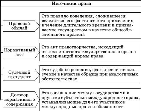 В России источниками права являются законы, подзаконные акты и договоры. В Великобритании, США, других странах, на становление правовой системы которых большое влияние оказало английское право, большую роль играют прецеденты. В России их применяют крайне редко. В странах с прочными патриархальными традициями значительную роль играют обычаи.