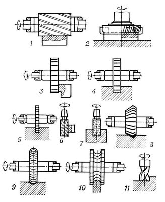 Рис. 1. Основные типы фрез: 1 — цилиндрическая; 2 — торцовая; 3 и 4 — дисковые пазовые; 5 — прорезная; 6 и 7 — концевые; 8 — угловая; 9 и 10 — фасонные; 11 — шпоночная.