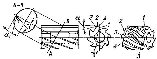 Рис. 2. Геометрические параметры режущей части цилиндрической фрезы: 1 — передняя поверхность зуба; 2 — задняя поверхность зуба; 3 — затылочная поверхность зуба; 4 — винтовая главная режущая кромка зуба.