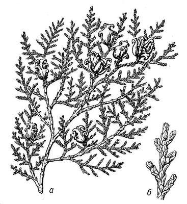 Биота восточная: а — ветвь с женскими шишками; б — веточка.