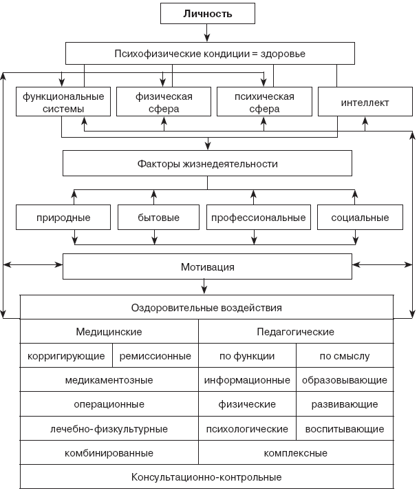 Как показано на рис. 10, целью оздоровительных воздействий на конкретную личность является обеспечение ее жизнедеятельности, т. е. способностей к многообразию видов деятельности, обусловленных необходимостью существования в определенных природных и социальных условиях, а также выполнения трудовых операций бытового и профессионального характера. Такие воздействия осуществляются через функциональные системы организма, являющиеся ведущими в осуществлении жизнедеятельности [62].