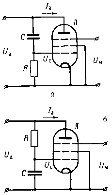 Реакти'вная ла'мпа, устройство, состоящее из электронной лампы и подключенной к ней фазосдвигающей цепи; обладает управляемым реактивным входным сопротивлением. Простейшая фазосдвигающая цепь содержит резистор R и конденсатор С, соединённые последовательно (рис.). Если (рис., а) выбрать 1/wC >> R, то фаза напряжения Uc на управляющей сетке лампы (обычно пентода) будет опережать фазу напряжения Ua на аноде на угол ~ 90° и фаза тока la в цепи анода, практически одинаковая с фазой Uc будет опережать Ua на тот же угол. Если (рис., б) 1/wC << R, то вместо опережения будет иметь место отставание по фазе. Такой сдвиг фаз (на 90°) между напряжением и током характерен для реактивных элементов электрической цепи — конденсатора и катушки индуктивности. Следовательно, сопротивление участка анод — катод лампы (входное сопротивление Р. л.) эквивалентно ёмкостному (рис., а) или индуктивному сопротивлению (рис., б). Величину реактивного сопротивления можно в некоторых пределах изменять, если управлять анодным током лампы, например изменяя по заданному закону напряжение смещения на управляющей или защитной сетке.
