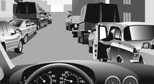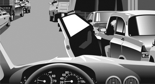 По узкому переулку с припаркованными по обеим сторонам машинами двигался автомобиль 1 со скоростью 40 км/ч (илл. 1). Водитель автомобиля 2, припаркованного справа, не заметил автомобиль 1 и открыл дверь, чтобы выйти из машины (илл. 2). Водитель 1 не ожидал такого развития событий, начал тормозить, но не смог избежать столкновения (илл. 3).