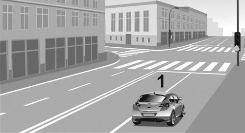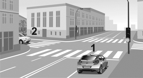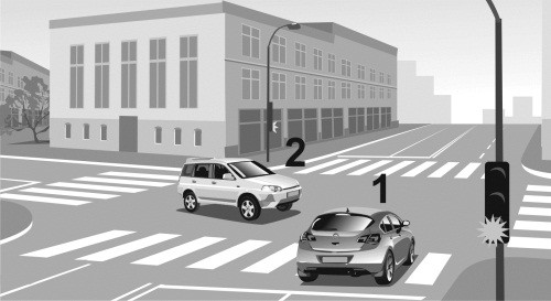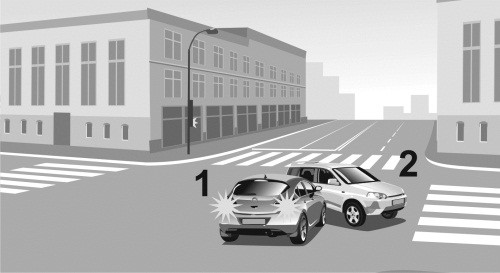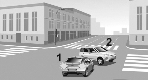 Автомобиль 1 приближался к регулируемому перекрестку на зеленый сигнал светофора и решил проехать через перекресток, не снижая скорости (илл. 1, 2). После выезда на перекресток водитель автомобиля 1 увидел автомобиль 2, который двигался наперерез ему на красный свет (илл. 3). Поскольку появление на пути автомобиля 2 было неожиданно для водителя 1, он не успел даже нажать на педаль тормоза и совершил столкновение (илл. 4, 5).