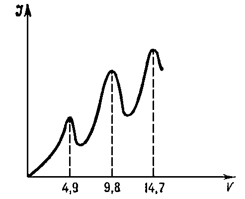 В опыте наблюдался монотонный рост I при увеличении ускоряющего потенциала вплоть до 4,9 в , т. е. электроны с энергией Е < 4,9 эв испытывали упругие соударения с атомами Hg и внутренняя энергия атомов не менялась. При значении V = 4,9 в (и кратных ему значениях 9,8 в, 14,7 в ) появлялись резкие спады тока (рис. 2 ). Это определённым образом указывало на то, что при этих значениях V соударения электронов с атомами носят неупругий характер, т. е. энергия электронов достаточна для возбуждения атомов Hg. При кратных 4,9 эв значениях энергии электроны могут испытывать неупругие столкновения несколько раз. Т. о. было доказано, что энергия атома изменяется не непрерывным образом, а скачкообразно и E = 4,9 эв – наименьшая порция энергии, которая может быть поглощена атомом Hg, находящимся в основном состоянии.