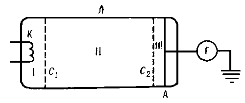 Рис. 1. Схема опыта Франка — Герца. В сосуде Л находятся пары ртути при давлении 1 мм. рт. ст . К — накаливаемый катод, С1 и С2 — ускоряющая и замедляющая сетки, А — анод. Ток регистрируется гальванометром Г.