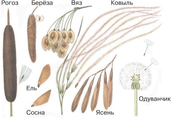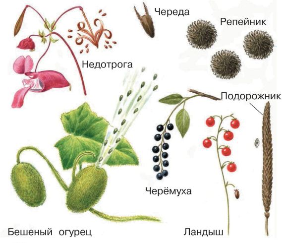 Семена растений распространяются с помощью ветра, насекомых, птиц, зверей или самостоятельно (бешеный огурец).