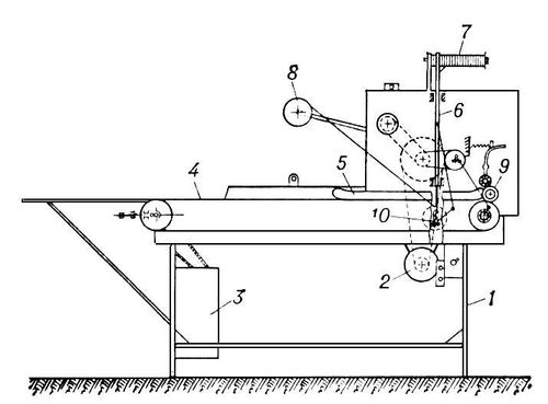 Схема табакопришивной машины: 1 — рама; 2 — электродвигатель; 3 — кнопочный включатель; 4 — подающий транспортёр; 5 — прижимной транспортёр; 6 — игловодитель; 7 — катушка нити; 8 — катушка шпагата; 9 — натяжной механизм; 10 — механизм петлителя.