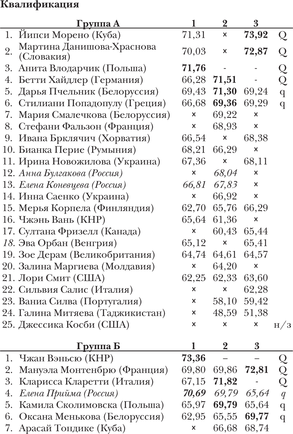 В квалификации хватало разочарований. Хотя 13-й результат (69,22) – самый высокий квалификационный результат в истории, не давший права выступить в финале. Мало того, показатели мест с 8-го по 31-е – рекордные для любых соревнований, причем за 65 метров. Только семеро выполнили норму – 71,50. Проходным оказался результат 69,36. Четыре метательницы (хорватка Ивана Брклячич, россиянка Елена Коневцова – 67,84,74,81 на отборе в Казани, белорусска Мария Смолячкова, украинка Ирина Секачева), посылавшие в этом году снаряд за 74 метра, не смогли так метнуть. Да и лидер сезона (77,32) белорусска Оксана Менькова прошла лишь с 11-м результатом (69,77).