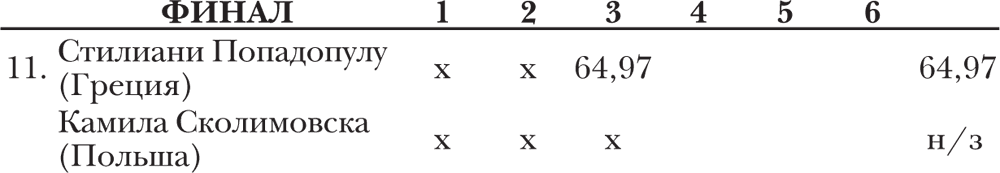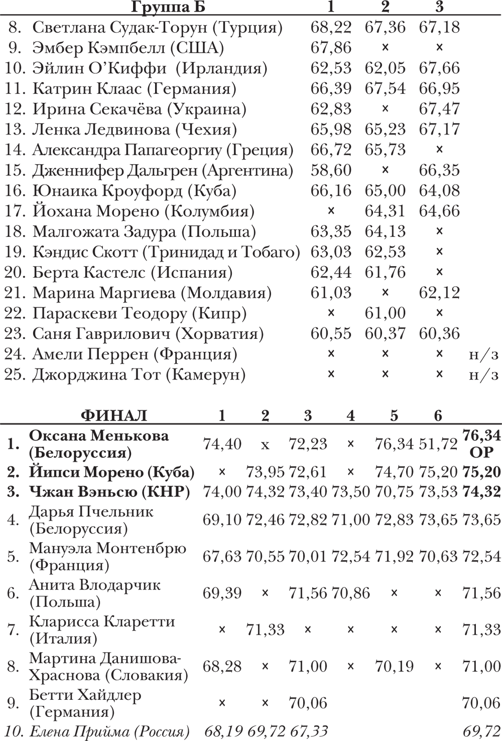 В пятой попытке Морено, мечтавшей стать наконец чемпионкой, удался хороший бросок. Она вышла вперед – 74,70, но только на несколько минут, пока в сектор не вышла Менькова. Оксана ответила олимпийским рекордом – 76,34. Морено не сдавалась и в шестой попытке прибавила – 75,20, но позиция ее не изменилась. Еще одна серебряная олимпийская медаль.