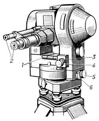 Тахеометр ТП: 1 — цилиндрический уровень; 2 — окуляры зрительной трубы и микроскопа; 3 и 4 — закрепительный и наводящий винты вертикального круга; 5 и 6 — то же горизонтального круга.