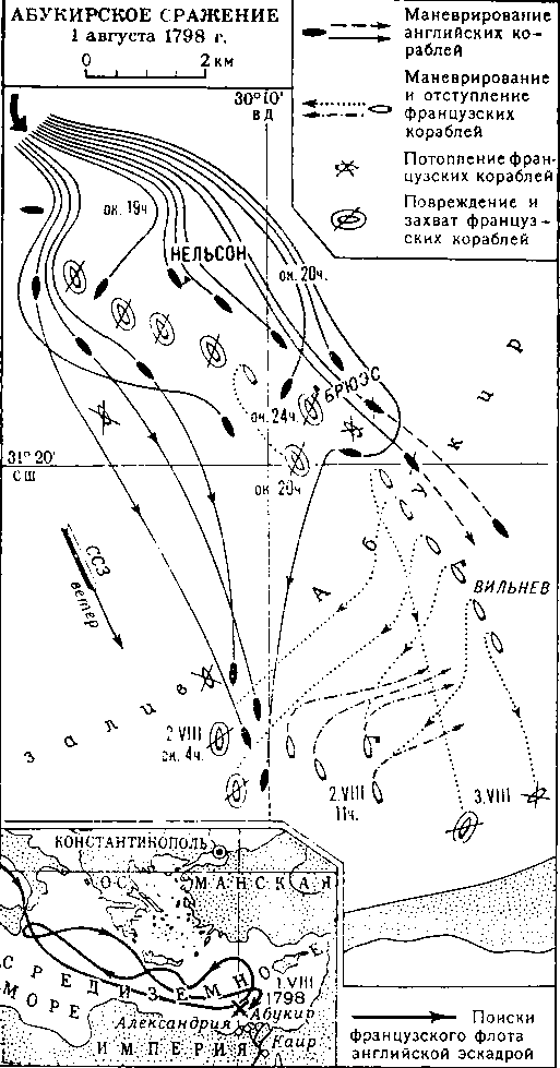 Абуки'р, остров и мыс в Египте (при впадении реки Нил в Средиземное море), около которого 1—2 августа 1798 произошло сражение между английским (контр-адмирал Г. Нельсон) и французским (вице-адмирал Ф. Брюэс) флотами во время Египетской экспедиции 1798—1801. Французский флот (13 линейных кораблей, 4 фрегата с 10 тыс. чел. и 1183 орудиями) стоял на якоре в Абукирском заливе. 1 августа английский флот (14 линейных кораблей с 8 тыс. чел. и 1012 орудиями) подошёл к А. неожиданно для французов. Сражение началось около 19 ч. Против 5 линейных кораблей французского авангарда Нельсон выделил 8 линейных кораблей (сосредоточение превосходящих сил на главном направлении), из которых 4 вели огонь со стороны берега, а остальные с моря. 2 английских линейных корабля вели бой с кораблями французского центра. К 21 ч. авангард и центр французского флота, были последовательно разбиты. К 12 ч. 2 августа было нанесено поражение французскому арьергарду (контр-адмирал П. Ш. Вильнёв), который накануне лишь наблюдал за истреблением французских кораблей. Французы потеряли 11 линейных кораблей и 2 фрегата, свыше 6 тыс. чел. убитыми, ранеными и пленными, англичане — около 900 чел. Коммуникации 30-тыс. армии Наполеона Бонапарта в Египте, связывавшие её с Францией, оказались перерезанными.