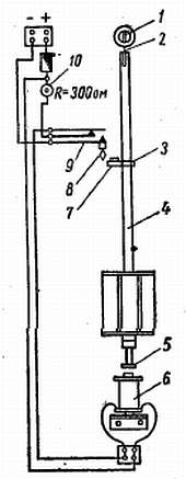 Взаимодействием гребенки 7 и собачки 8 в процессе колебания маятника создается замыкание контактов посылки тока к обмотке электромагнита. Контакты от экстратока защищают сопротивлением 300 ом (катушка 10).