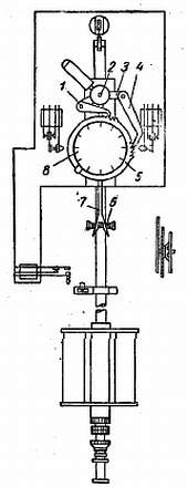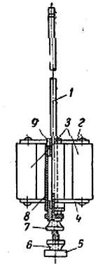 Компенсационная трубка вверху свободно находит на втулку, внизу опирается на регулировочную гайку маятника с делениями, которая закрепляется контргайкой 1. В нижней части стержня закреплен якорь 5 маятника с контргайкой 6.