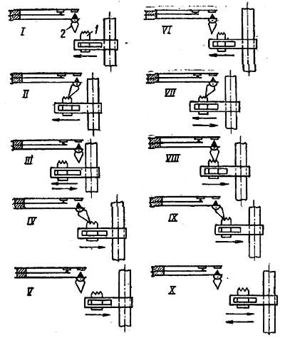 В положении I, VI маятник движется справа налево. Гребенка 1 находится значительно правее собачки и приближается к ней.