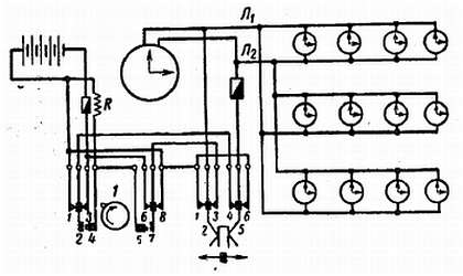 В промежутках между импульсами оба линейных провода вторичных часов замкнуты и подключены на плюс батареи. Включение и выключение тока ко вторичным часам производится через сопротивление 100 ом.