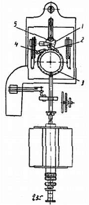 Увеличивав зазор между башмаками, создаем более благоприятные условия использования магнитных силовых линий для притяжения якоря 5, укрепленного на стержне 1 маятника. При этом амплитуда колебания маятника увеличивается. Увеличивая зазор между якорем 5 и башмаками 2 катушек электромагнита маятника 3, ослабляем силу притяжения якоря. Нормальное расстояние между ниш должно быть 1,5 мм. Якорь закрепляется контргайкой 4.