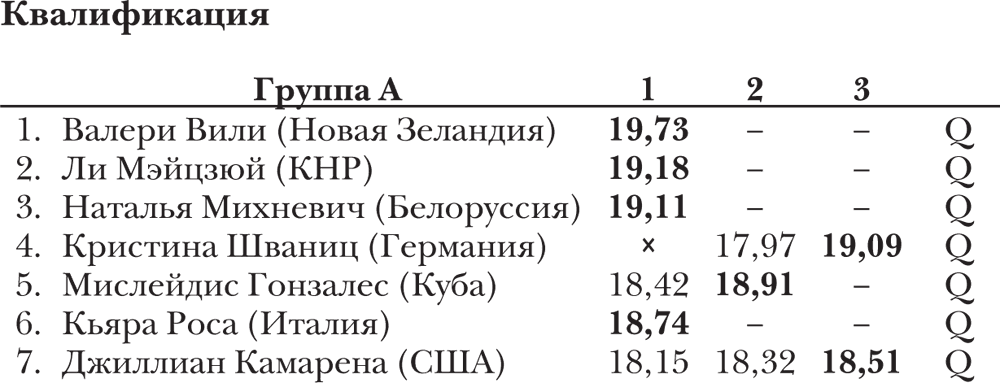 Лучший результат, причем в первой же попытке, показала чемпионка мира Валери Вили из Новой Зеландии – 19,73. Но по своему лучшему результату сезона (20,19, правда, принесшему ей победу на зимнем чемпионате мира в Валенсии) она значительно уступала белорусским толкательницам Надежде Остапчук (20,98) и Наталье Михневич (прежняя фамилия Хоронеко, она вышла замуж за бронзового призера Игр в этом же виде Андрея Михневича). В квалификации они также в первой попытке, не напрягаясь, выполнили норму, показав 19,11 – Михневич и 19,08 – Остапчук.