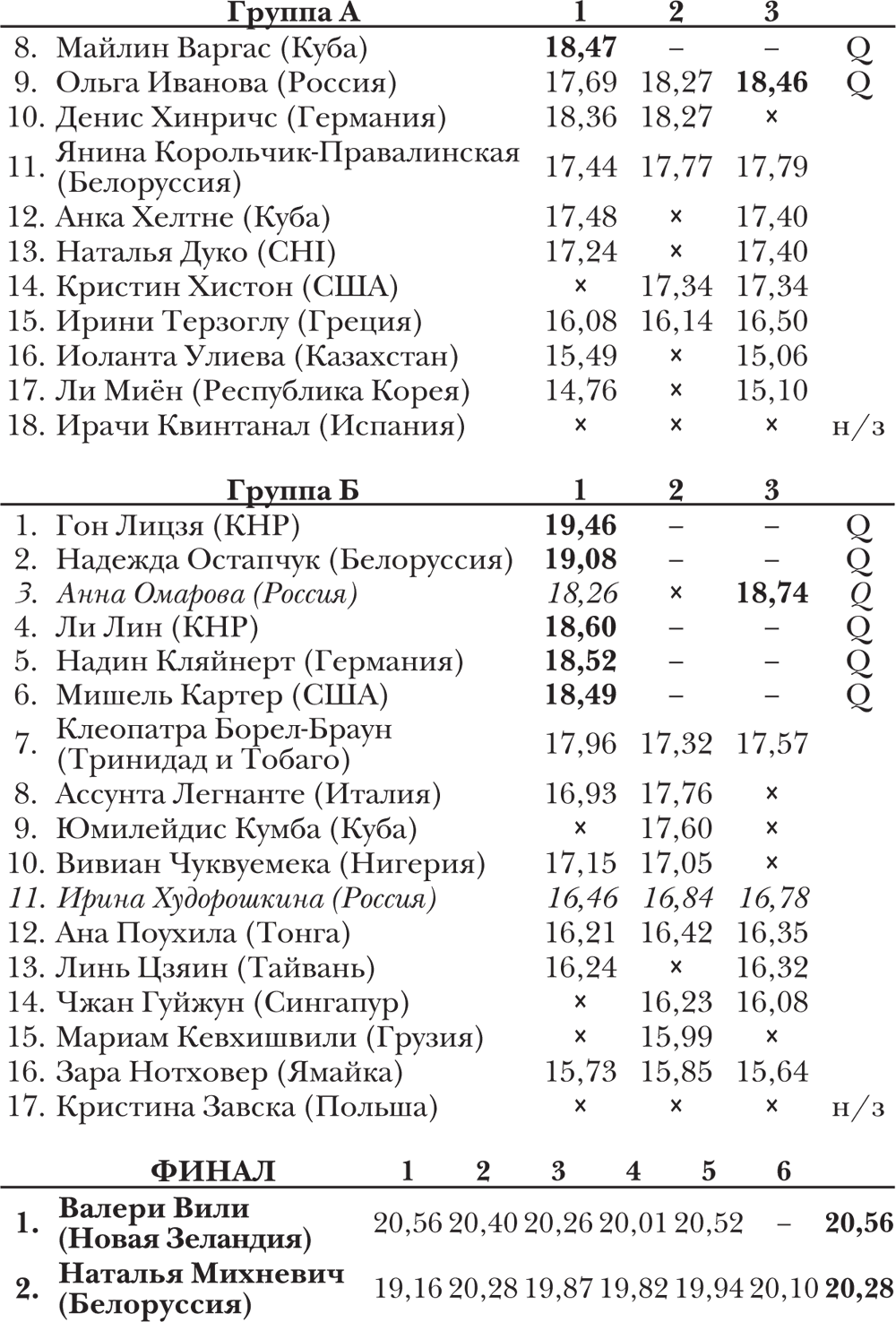 Михневич еще в одной попытке послала ядро за 20 метров – 20,10, но догнать новозеландку не смогла. Вили, которая хотя и не улучшила свой первоначальный результат, показала впечатляющую серию: 20,56; 20,40; 20,26; 20,01; 20,52. От последней попытки, когда ее победа стала реальностью, Валери просто отказалась, побежав с флагом круг почета. Мощная (193 см/123 кг) чемпионка мира во всех возможных категориях (летняя 2007 г. и зимняя 2008 г., среди юношей 2001 г. и юниоров 2002 г.) 23-летняя Вили четыре года назад в Афинах заняла восьмое место (18,56) и, наконец, теперь завоевала олимпийское золото. У Новой Зеландии среди женщин не было побед более 50 лет, когда в 1952 году Иветт Уильямс выиграла прыжок в длину.