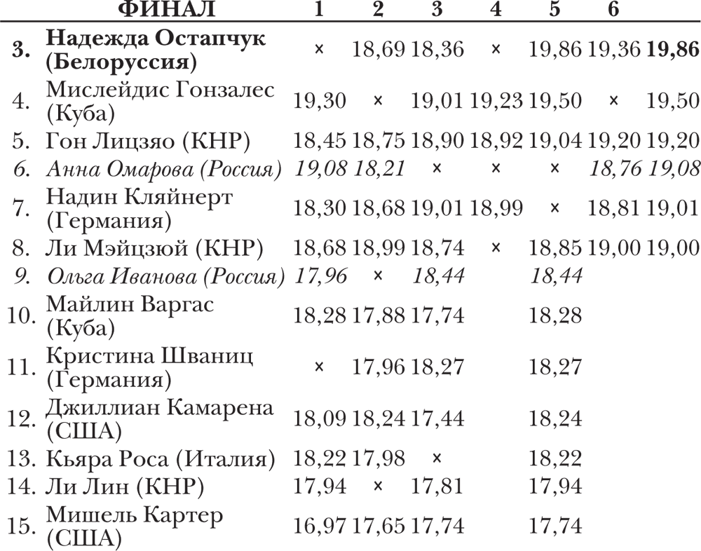 Но если тогда, как, впрочем, и в Валенсии, Вили вела борьбу с Остапчук, то в Пекине пыталась принять вызов Михневич, которая после 19,16 в первой попытке толкнула на 20,28 – во второй. Остапчук же была явно в кризисе. Имея только 18,69, она последней, восьмой, пробилась в финал. Но наконец в пятой попытке собралась и показала более-менее достойный результат – 19,86, что вывело ее на 3-е место. Она обошла кубинку Мислейдис Гонзалес, установившую личный рекорд – 19,50.