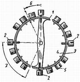 1 — разрез; 2 — позиционные винты; 3 — латунь; 4 — сталь; 5 — винты для температурной регулировки; 6 — нейтральная точка находится в этом районе; 7 — эта часть баланса наиболее подвержена влиянию температуры.