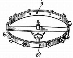 Фиг. 144. Температурная регулировка, выполняемая для того, чтобы часы спешили при высокой температуре. В, В1 — отверстия для компенсационных винтов.