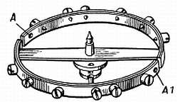 Фиг. 145. Температурная регулировка, выполняемая для того, чтобы часы спешили при высокой температуре. А, А1 — отверстия для компенсационных винтов.