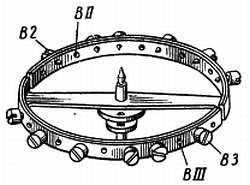 Существуют два способа уравновешивания баланса: один — с помощью обычного кронциркуля, другой — с помощью уравновешивающего устройства. В первом случае баланс помещают в кронциркуль, где баланс должен остаться свободным и иметь осевой зазор. Кронциркуль берут в левую руку и прижимают его к краю стола так, чтобы баланс повис над столом под углом приблизительно 45°. На внутренней стороне одной из ножек кронциркуля сделаны засечки (фиг. 154), и если по этим засечкам провести ребром пинцета или отвертки, баланс начнет медленно вращаться.