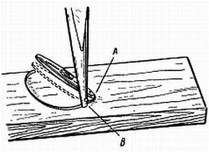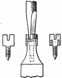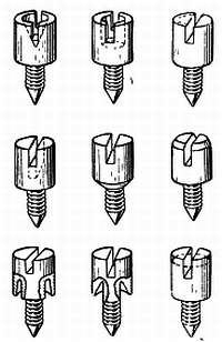 Второй способ, практикуемый в Америке, состоит в выборке прорезей в нижней части головки винта (фиг. 151). Прорезь делают так: винт насаживают на специальный режущий инструмент и вращают винт отверткой, для чего применяют режущие инструменты различных размеров. Преимущества этого способа заключаются в том, что внешний вид винта не изменяется, а операция не отнимает много времени. Увеличение прорези производится только на довольно больших винтах, например у балансов часов в 13 линий и больше.