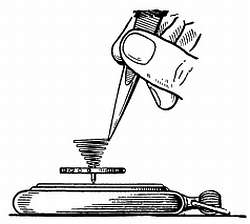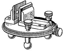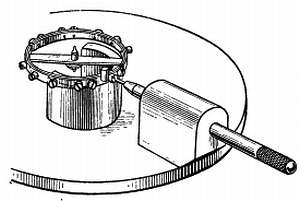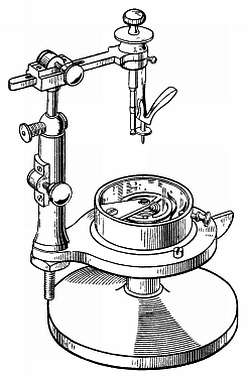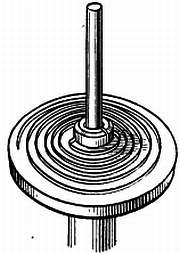 На стержень, суживающийся к одному концу, насаживают с трением латунную трубку, в которой имеется прорезь, позволяющая трубке перемещаться вверх и вниз по стержню. На латунной трубке укрепляют пластинку. На пластине шеллаком закрепляют старый, покрытый эмалью циферблат с секундными делениями. Отверстие в центре шкалы должно быть достаточно большим и может быть расширено с помощью карборундового карандаша, которым снимают слой эмали, а затем расширяют отверстие круглым напильником малого диаметра. Нажимая напильником на эмаль и снова отпуская, производят срезание только при нажиме, благодаря этому эмаль не будет скалываться. Сколы эмали на нижней стороне циферблата несущественны. Затачивают штифт для закрепления спирали и тщательно полируют. Для определения длины штифта его предварительно вводят в отверстие колодки. С обоих концов штифта наносят отметки в тех местах, где штифт должен быть отрезан. Заусенцы снимают мелкозернистым оселком (например, камнем арканзас).