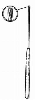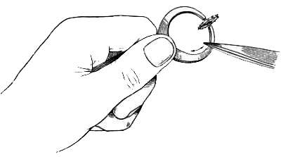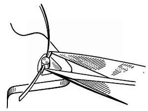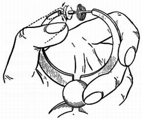 Это обычная швейная игла, половина ушка которой сточена в виде вилки. Спираль придерживают так, как показано на фиг. 159; вращая иглу вперед и назад, можно легко разломить спираль.