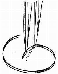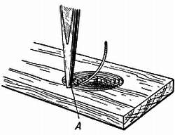 При применении упомянутого способа спираль кладут на кусок мягкого дерева и удерживают пинцетом в точке А, где должен быть первый изгиб (фиг. 186). Спираль плотно зажимают пинцетом, но так чтобы она могла перемещаться между концами пинцета. Затем медленно и осторожно погружают концы пинцета в мягкое дерево, спираль при этом согнется вверх.
