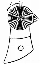 На фиг.184 показан изгиб спирали вниз. Способ этот надежный и не требует больших затрат времени. Он применяется для обработки спирали из какого-либо мягкого металла — инвара, элинвара или бериллия, т. е. из металла, который мягче термообработанной стали.