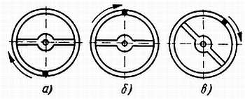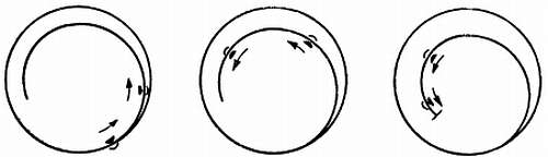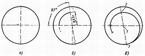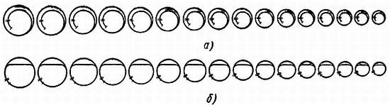 Этот способ регулировки имеет ряд недостатков. При больших амплитудах колебания результат будет обратный — в положении заводной головкой вверх часы вместо опережения или, по крайней мере, незначительного отставания станут показывать значительное отставание. На фиг. 200 показаны причины этого явления: а — утяжеленная точка неподвижна; б — при одном повороте; в — при 11/4 поворота.