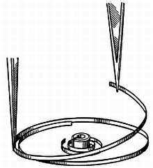Отламывают штифт. Проверяют, плоско ли лежит спираль на диске. Если придется производить подгонку, чтобы расположить спираль на диске плоско, т. е. потребуется поднять или прижать ее, надо повернуть ее в отверстии с помощью штифта. Затем закрепляют спираль штифтом с помощью пинцета или толкателя.