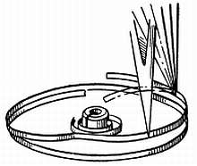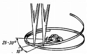 Температурная регулировка выполнена и часы будут давать точное или почти точное показание времени. Иногда температурную регулировку можно производить, добавляя шайбы или колодки к винтам 1 и 2; в этом случае для сохранения первоначального веса баланса поступают следующим образом: винт 3 снимают и кладут на весы, рядом с ним кладут две шайбы баланса; на другую сторону кладут винт 1; для уравновешивания вес винта 3 уменьшают, углубив прорезь шлицевым напильником или спилив головку, если пропиливания шлица недостаточно. Винт 4 обрабатывается так же, чтобы сохранить равновесие баланса. Если головка винта уменьшена, ее начисто обрабатывают мелкозернистым оселком и полируют. Для уменьшения веса винтов баланса существуют и другие способы: косая заточка внутренней части шлица винта сверху (фиг. 150). Эта операция известна как срезание кромки и выполняется она трехгранным напильником.