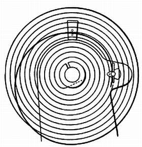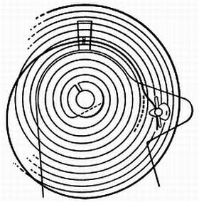 Если заштифтовка произведена тщательно, то спираль должна оказаться точно центрированной. Проверку концентричности спирали следует производить на белом фоне. Можно проследить за витками спирали глазом и, сравнивая ее с чертежом, сделать ее идеально верной (фиг. 163).
