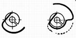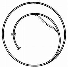 Часы с правильной концевой кривой спирали не обязательно должны обладать одинаковым ходом во всех положениях. Если часы отстают в вертикальном положении, концевую кривую следует переместить ближе к центру. Сделать это можно двумя способами. Первый способ состоит в образовании петли концевой кривой, как показано пунктирной линией на фиг. 196, что придает концевой кривой дополнительную жесткость; другой в придании витку формы, которая показана пунктирной линией на фиг. 197, чтобы приблизить изгиб к центру.