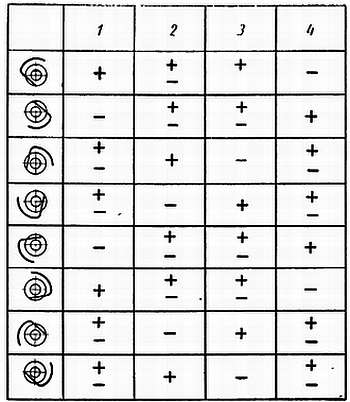 1 — заводной головкой вверх; 2 — заводной головкой вправо; 3 — заводной головкой влево, 4 — заводной головкой вниз.