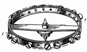Винт 1 вынимают из баланса и кладут на весы, на другую сторону кладут новый платиновый винт, он будет значительно тяжелее. Затем весы очень тщательно уравновешивают, положив винт 3 из баланса на весы рядом с винтом 1 и, если будет достигнуто равновесие, это значит, что винты 1 и 2 должны быть удалены с каждого из концов, чтобы сохранить первоначальный вес баланса и таким образом сохранить то же показание времени. Итак, винты 1 и 2 сняты и на их место установлены платиновые винты. Чтобы сохранить равновесие баланса, надо проделать то же с винтами 3 и 4.