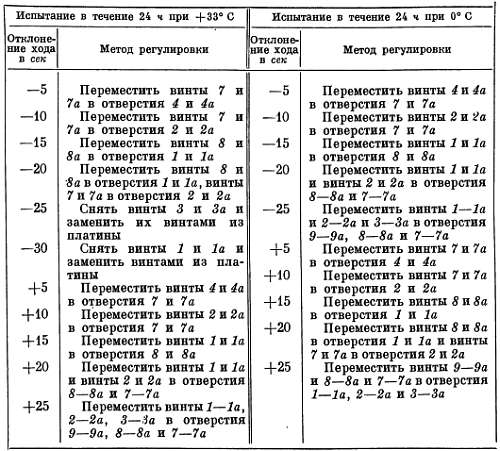 Приведенная здесь табл. 1 может служить лишь общим руководством, а не является точной таблицей. В ней показаны возможные преимущества перемещения винтов баланса и приведены некоторые данные о влиянии его на ход часов. Для большей простоты совсем не учитывается существующее положение винтов в балансе и допускается, что можно переместить пару винтов, как показано в таблице. На практике приходится перемещать винты в наиболее близкие отверстия.