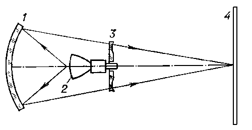 Рис. 1. Оптическая схема проекционного устройства с зеркально-линзовым объективом и кинескопом: 1 — сферическое зеркало; 2 — проекционный кинескоп; 3 — корректирущая линза; 4 — светорассеивающий экран.